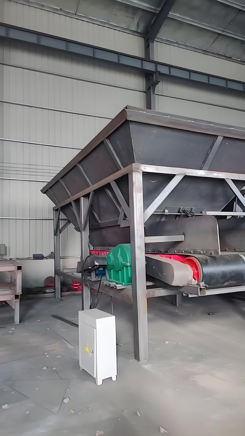 工作时,电动机通过减速机带动给料机工作。运转时,料仓内的物料随着皮带一起移动,并向出料口的一方移动,经闸门或刮刀排出物料。给料机排出量的大小可用刮刀装置或闸门来调节。